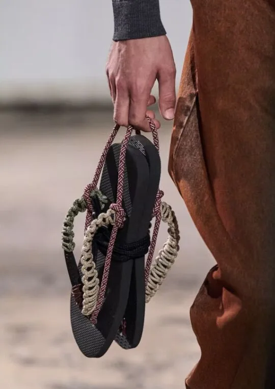 Le iconiche infradito brasiliane sono state reimmaginate attraverso corde marine, intrecci di cuoio e texture lanose che evocano le reti da pesca e i paesaggi battuti dal vento della Bretagna. Il risultato? Un dialogo sorprendente tra l’arte popolare brasiliana e l’eleganza rude della tradizione bretone.