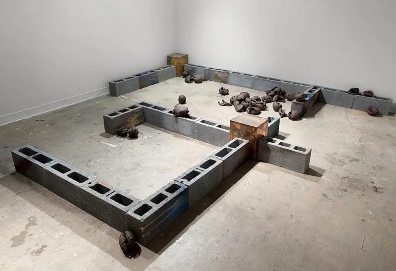 Dice l’artista: “…ho ricostruito parte della fondazione della casa della mia famiglia sul pavimento di cemento del mio studio a New York. Vole vo allineare e riconoscere due mondi molto diversi. Questa piattaforma ibrida mi ha permesso di chiedermi come i progetti storici siano letteralmente portati a casa, come possono essere attualizzati nel mio mondo e nella presenza dello spettatore. Il piano terra della mia casa, incluso il mio letto, è stato costruito interamente con blocchi di cemento, dal pavimento al soffitto, -conosco la sua texture da quando ero bambina e tracciavo i bordi dei blocchi di cemento dipinti con le mia dita e i piedi….ho posizionato una seconda scatola di rame nel punto di intersezione di tre pareti di blocchi di cemento, evocando la base di una colonna. Volevo che l’effetto patinato variegato creato da sale, aceto, torcia e zolfo evocasse antiche mappe e topografie geologiche…”