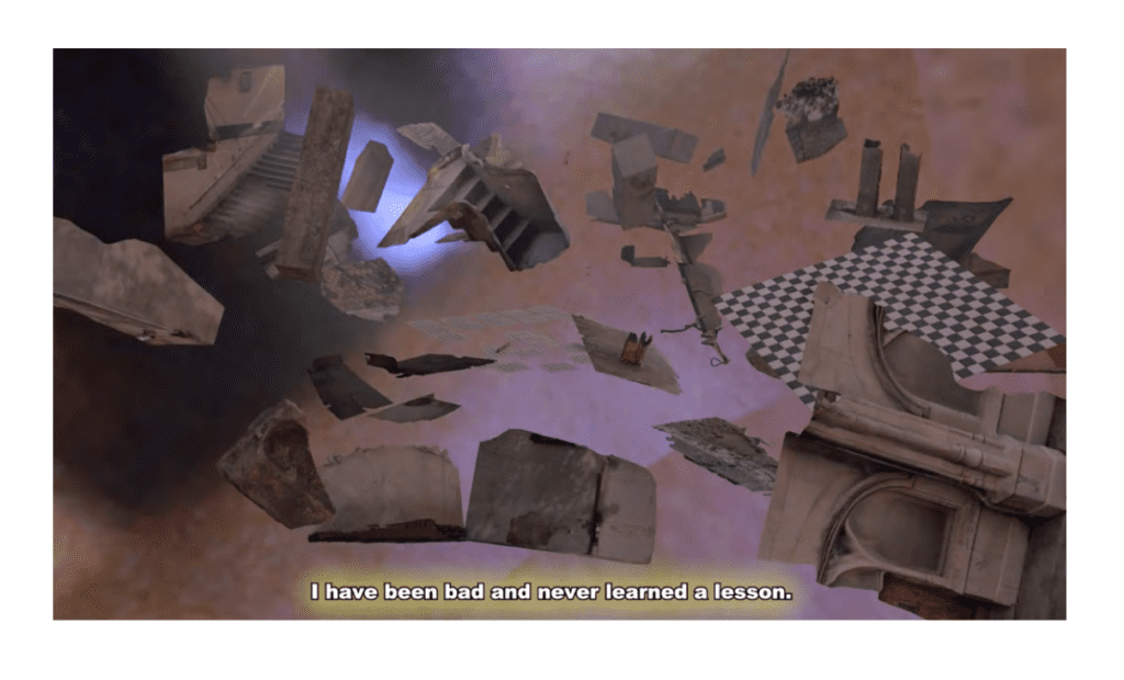 Successivamente il video si trasforma e mostra un mondo distorto formato da scansioni architettoniche in 3D che sono tratte dai percorsi quotidiani di Amina.