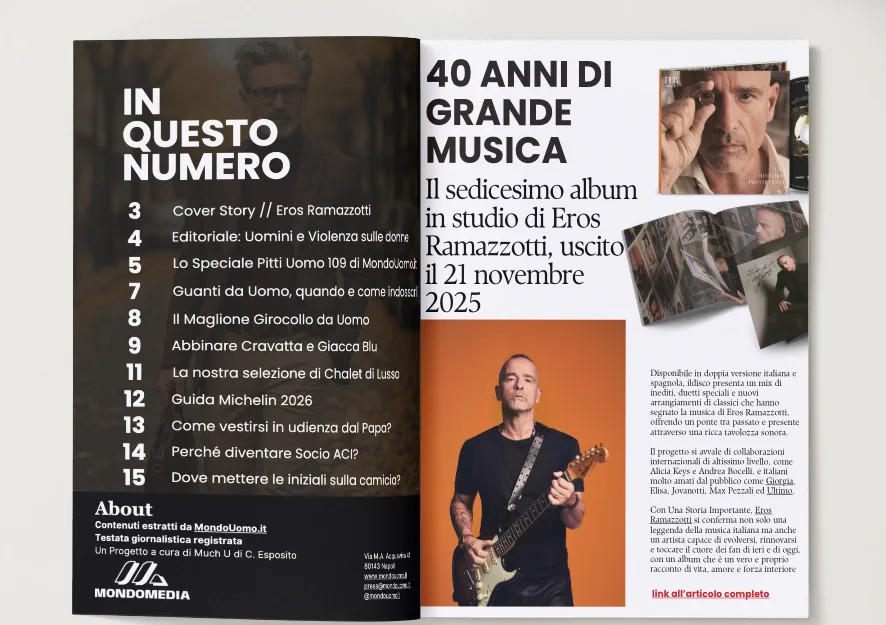 In copertina c’è Francesco Pio Esposito, giovane promessa del calcio italiano, simbolo di una generazione che unisce disciplina, ambizione e stile autentico. Un volto che rappresenta il futuro: concreto, elegante, capace di guardare avanti senza perdere radici.