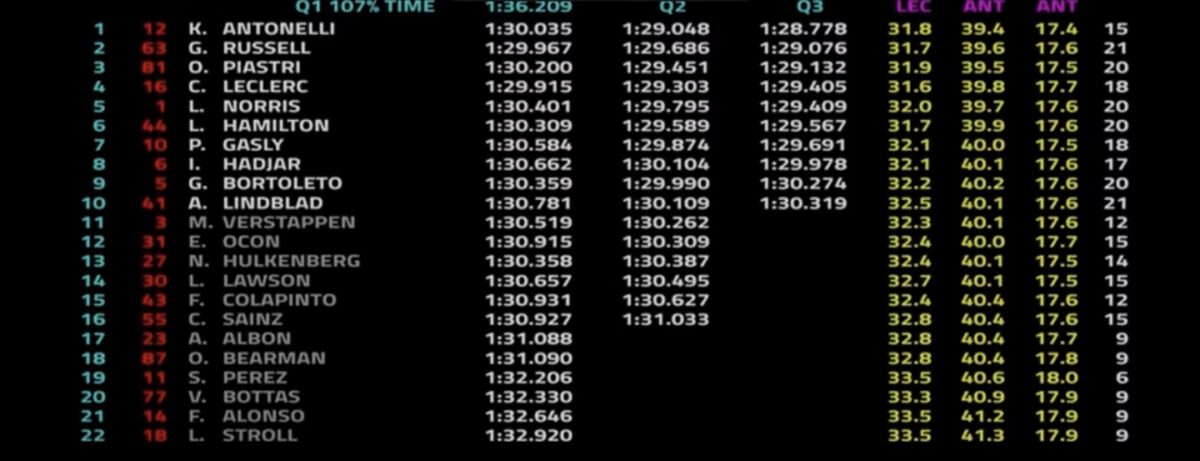 Sorpresa di queste qualifiche (non per chi ci ha seguito negli articoli delle prove libere) Gasly su Alpine e le Audi, fortissime su questo tracciato così energivoro, con un Super Bortoleto qualificato in Q3 e poi menzione particolare per Lindblad su Racing Bulls che ha eliminato Verstappen.